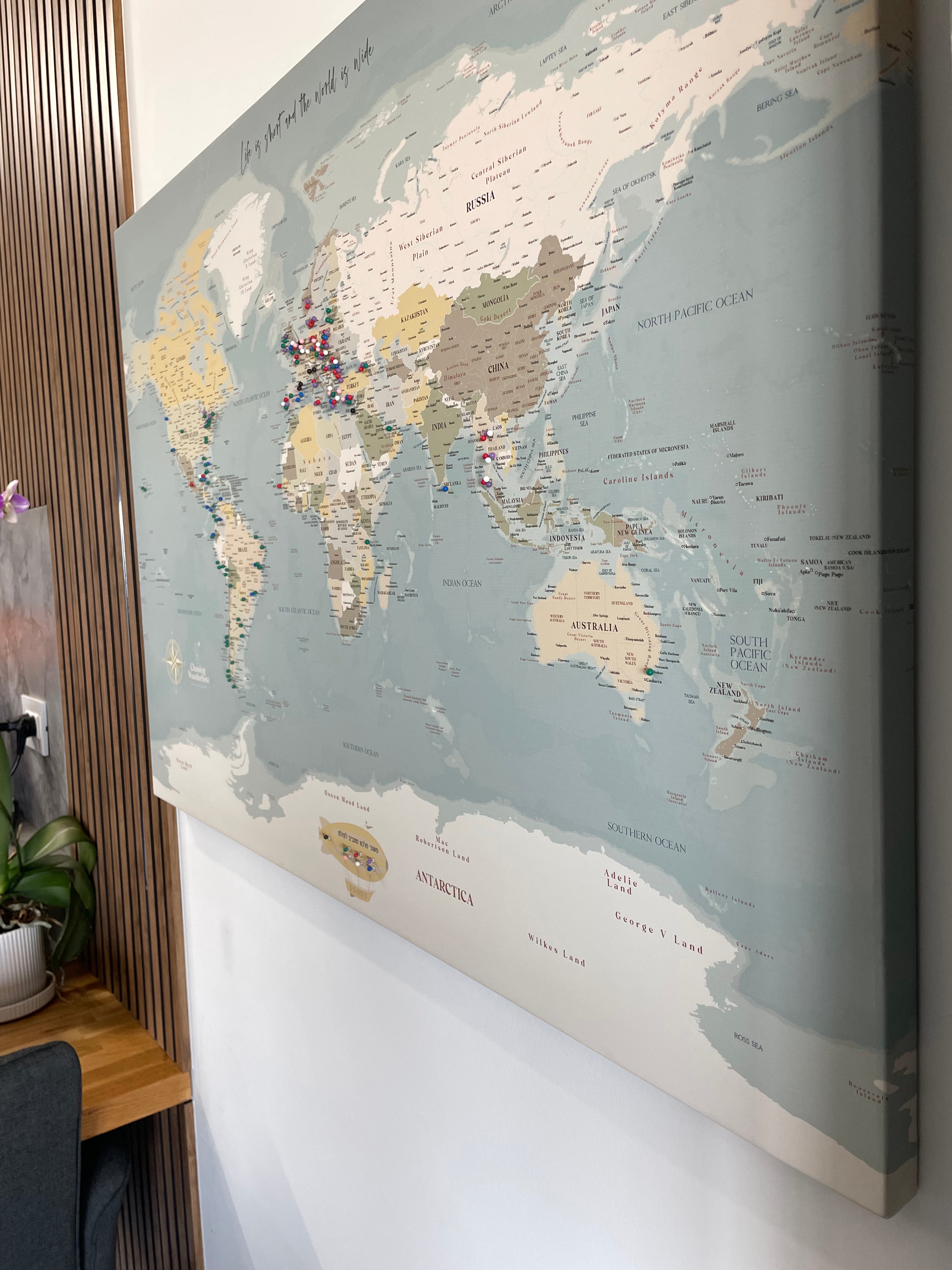 כל מפת עולם ננעצת מודפסת על קנבס איכותי ומתוחה על מסגרת עץ, ומשלבת בין עיצוב אומנותי להתאמה אישית.